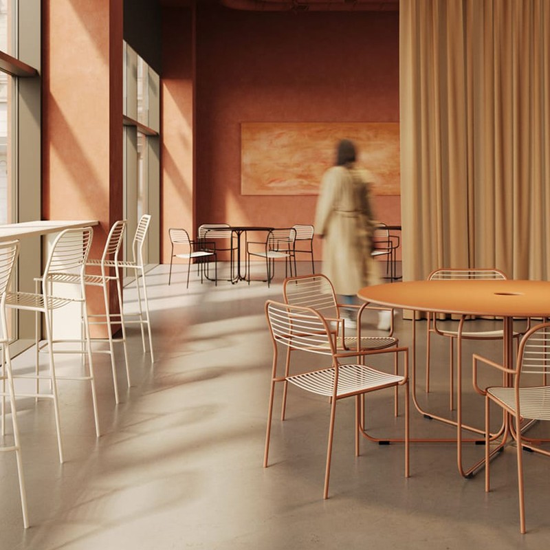 非常适合那些稍矮的吧台或舒适的厨房岛台。它恰到好处地平衡了休闲与功能性。全金属版本非常适合户外使用,而软座版本则专为室内打造,让你在品尝咖啡的同时,也能惬意地休息,显得优雅别致。