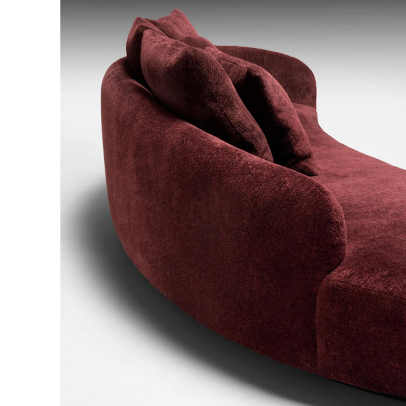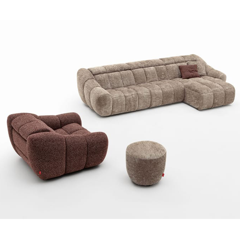 柔软、丰富的软垫皮革被巧妙地悬挂起来,创造出精致优雅的褶皱,而在背部,bouclé面料增强了沙发的柔软性。