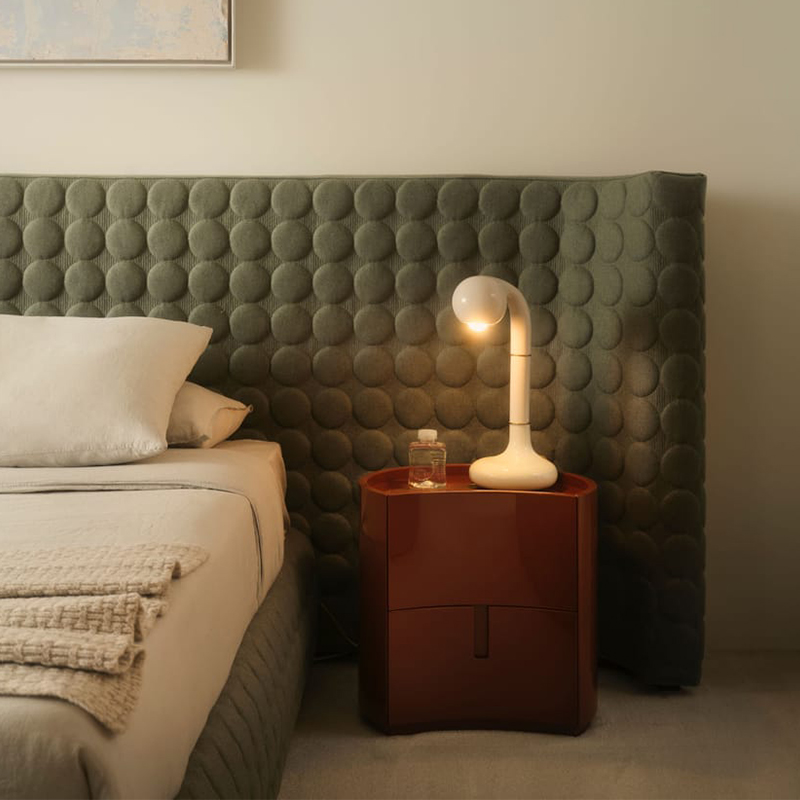 这款无抽屉设计的床头柜为卧室增添了现代元素,并营造出引人注目的效果:Polar是卧室中的圆形桌子。