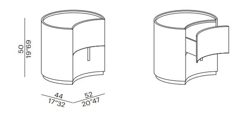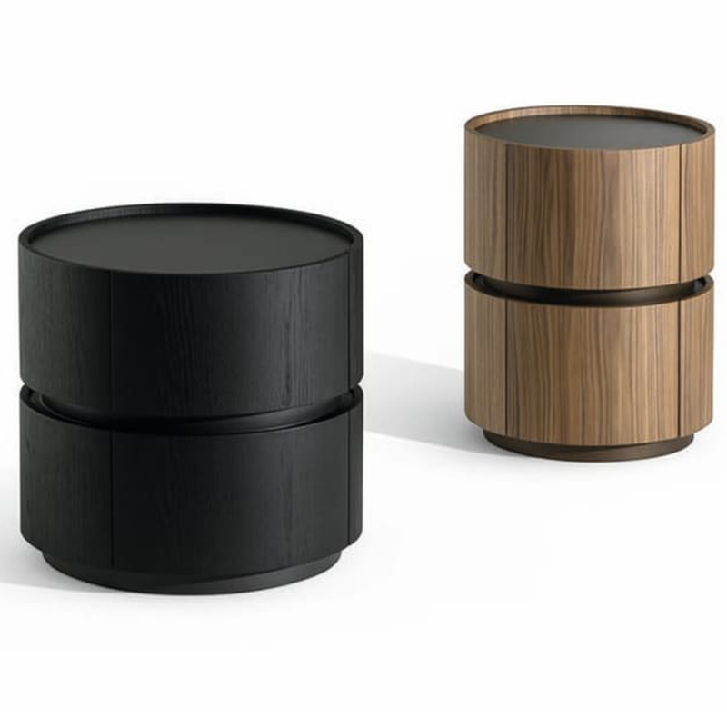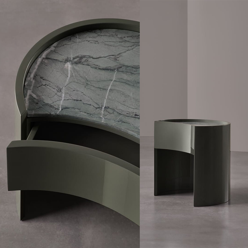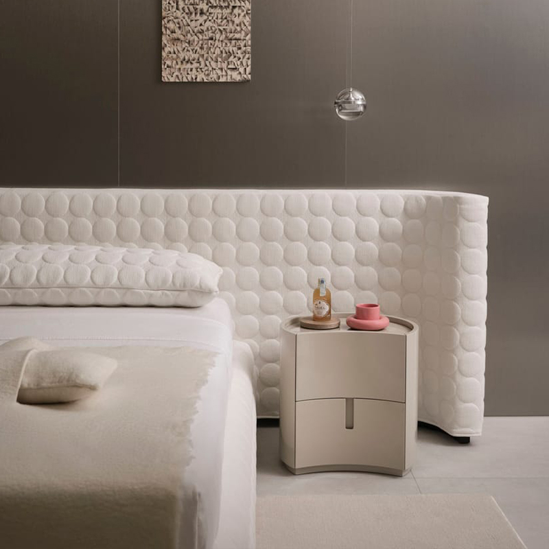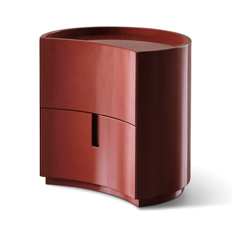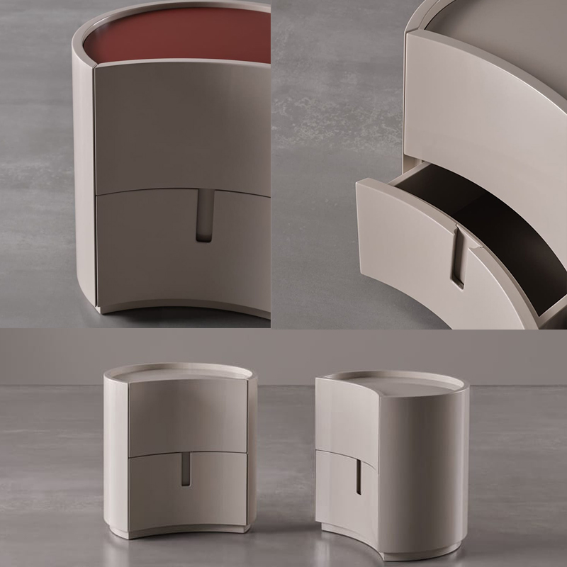 简约而实用的造型。Johnny是一款圆柱形床头柜,配有抽屉或柜门,采用凹形前部设计,顶部较低,可选择亮光或哑光漆面。