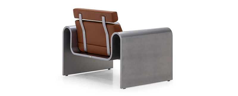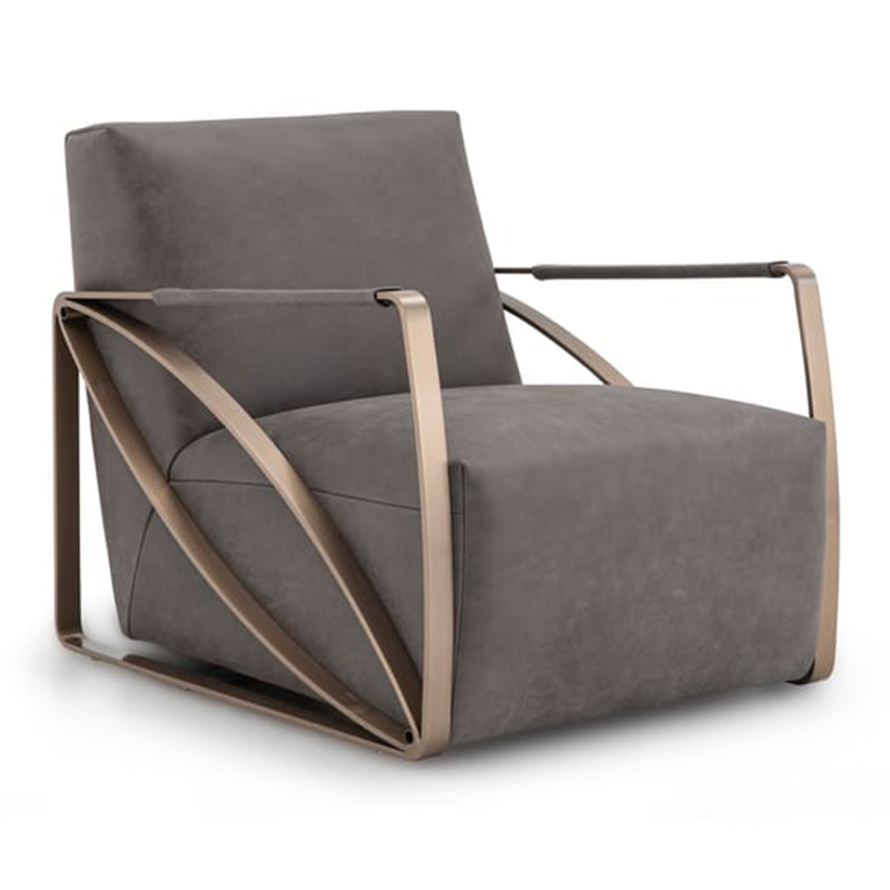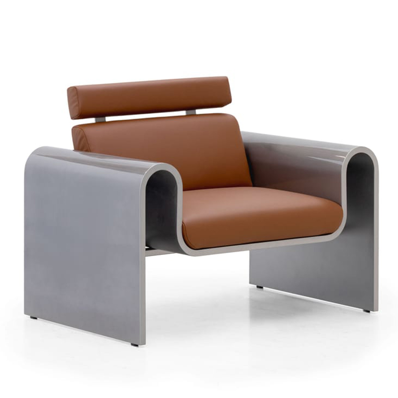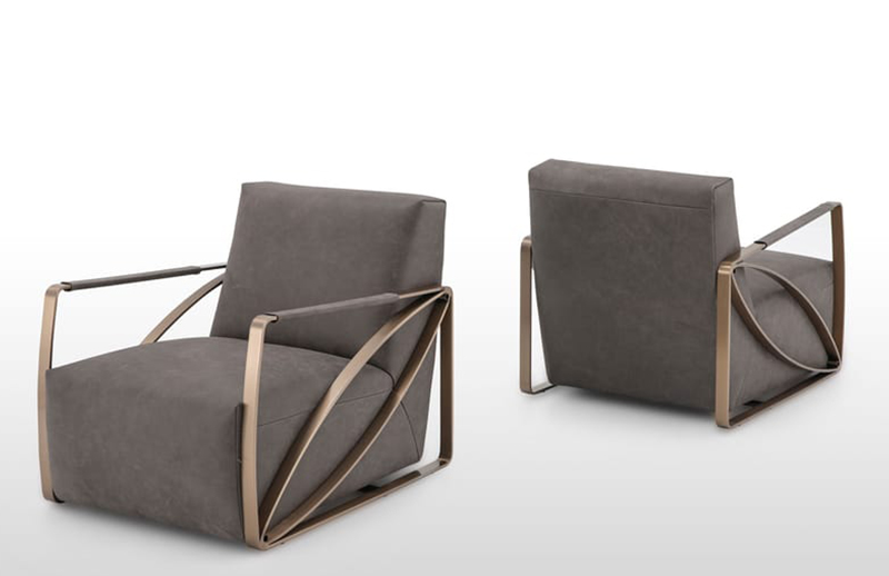 其玫瑰金不锈钢框架与其高端感觉相呼应。从接缝质量上可以欣赏到的精致皮革作品只能与时尚高级定制相媲美。其宽阔而舒适的座位区,略微向后倾斜,保证了极佳的人体工程学舒适度。时尚的金属扶手进一步增强了设计。