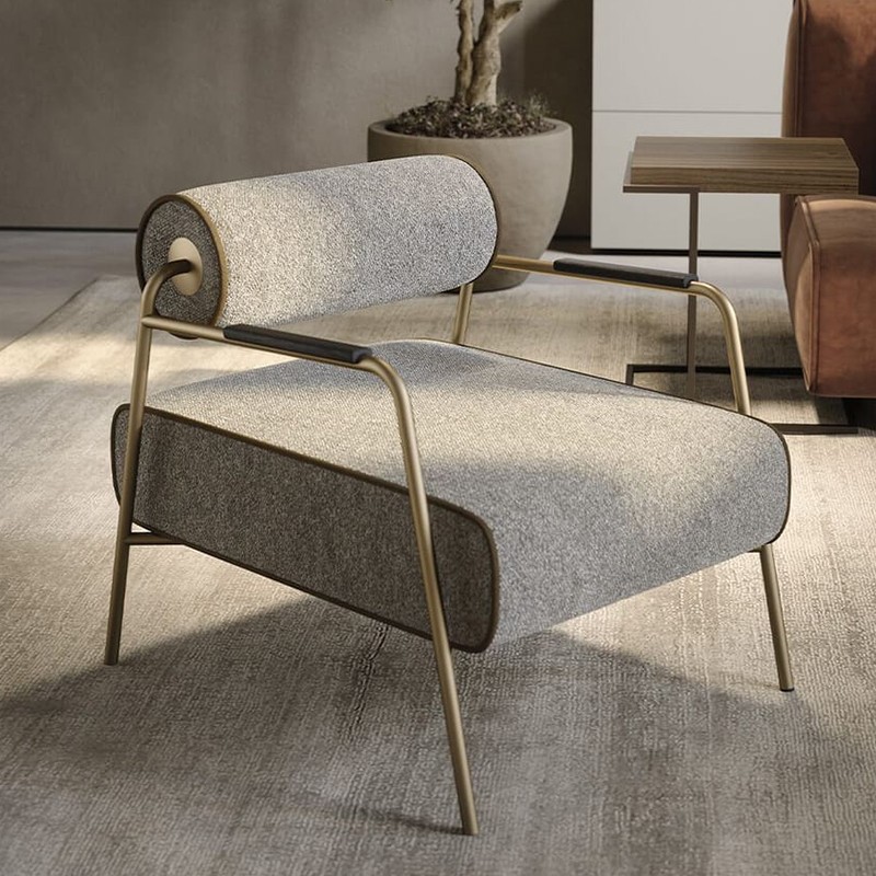 Lapis是一种织物扶手椅,金属扶手覆盖着皮革。