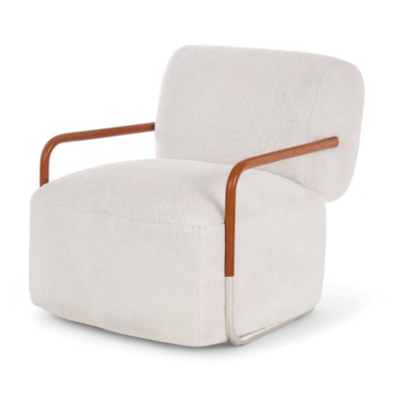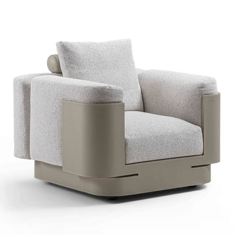 以更紧凑、更亲密的形式体现了它的优雅。扶手椅专为那些欣赏每一个细节的精致的人而设计,通过结构和柔软度的无缝平衡来增强其雕塑感。其紧凑的尺寸放大了精致的工艺,吸引了人们对延伸到扶手前部的皮革底座的关注。这种连续的设计元素通过裁缝专业知识丰富了其美学:奢华与功能还美和谐。