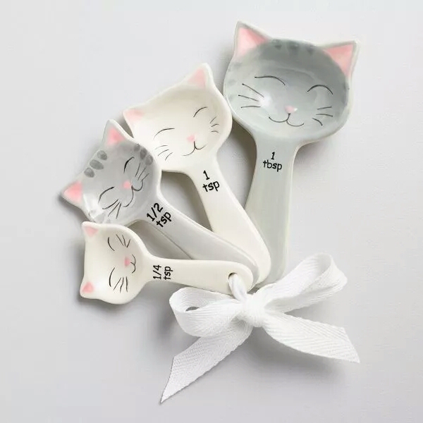 猫测量勺子和碟子:这些陶瓷测量勺用缎带蝴蝶结装饰的勺子让烘焙再次变得有趣!