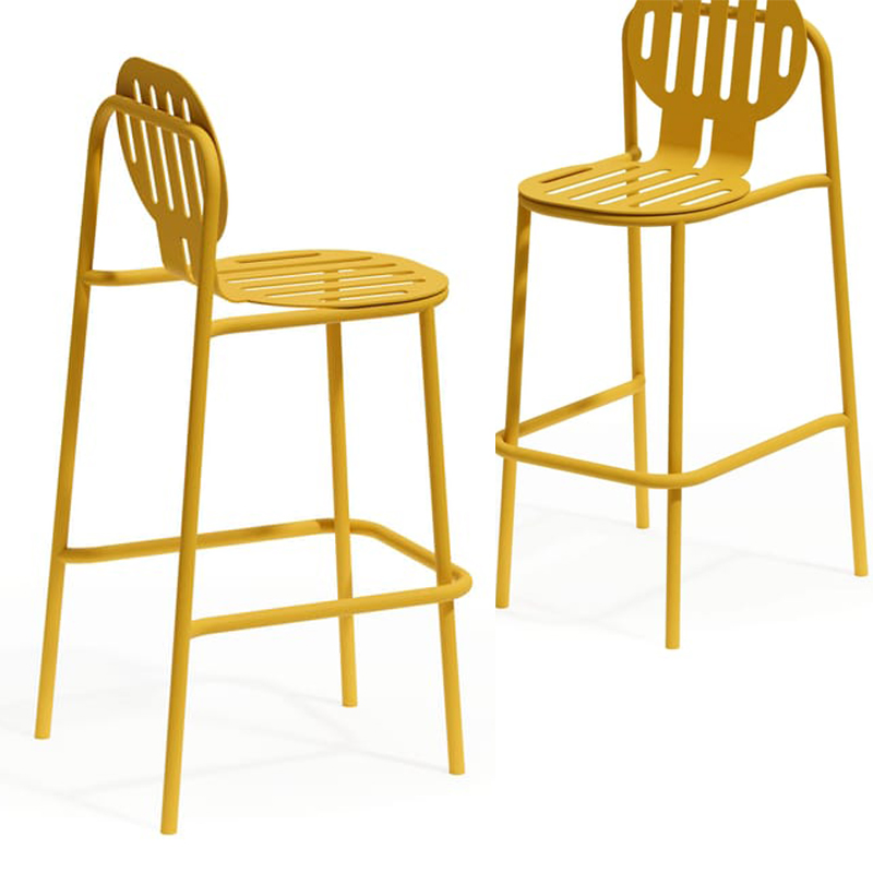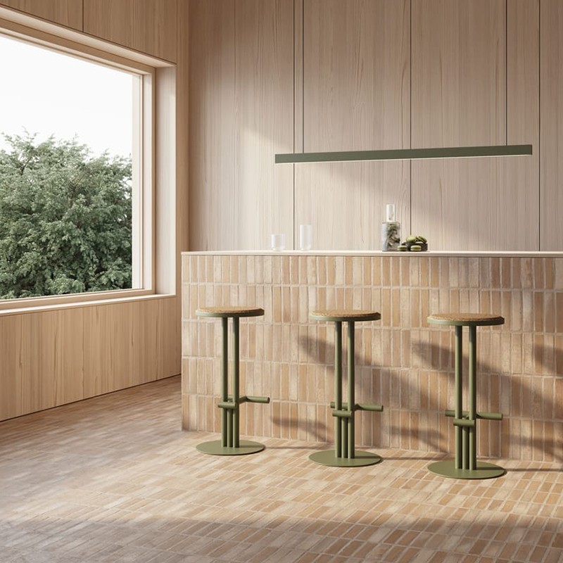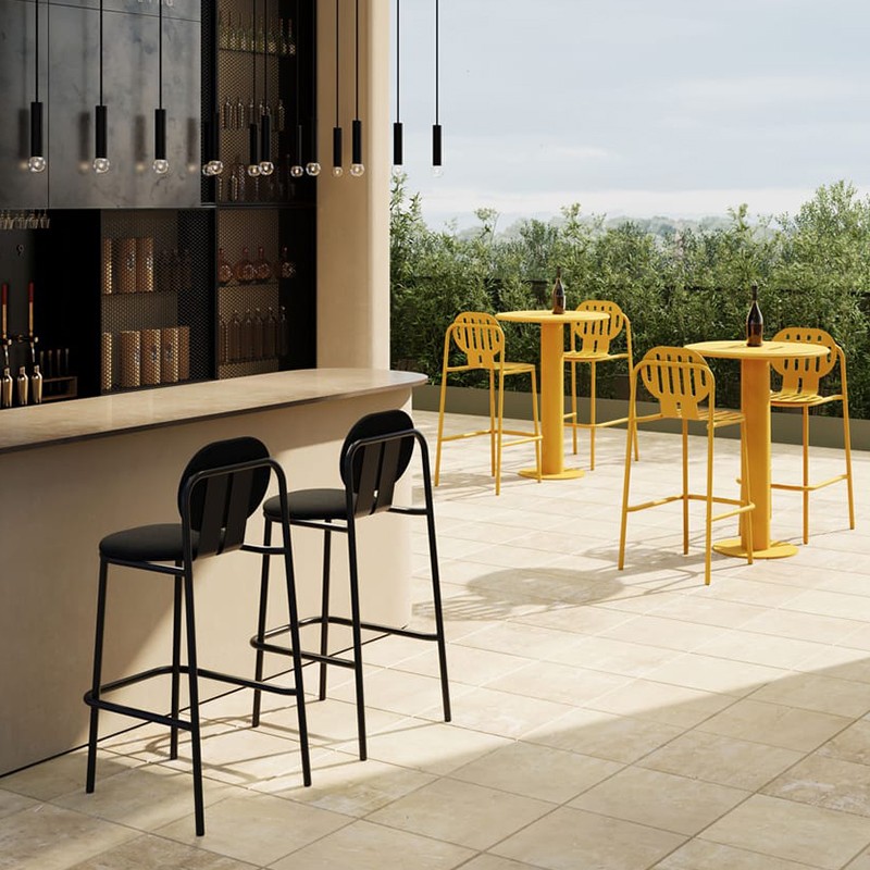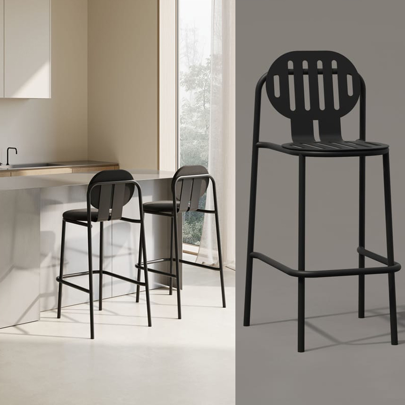 非常适合那些稍矮的吧台或舒适的厨房岛台。它恰到好处地平衡了休闲与功能性。全金属版本非常适合户外使用,而软座版本则专为室内打造,让你在品尝咖啡的同时,也能惬意地休息,显得优雅别致。