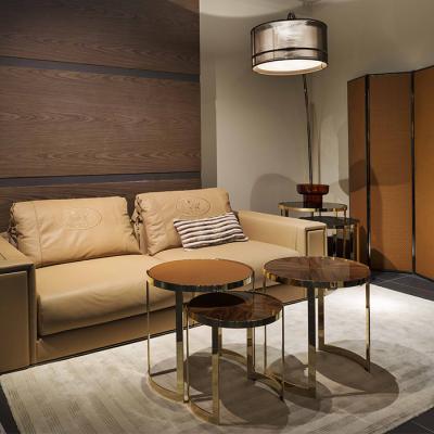 未来咖啡桌与组合式沙发底座遥相呼应,搭配采用圆角设计的方形大理石桌面,由金属框架支撑,可以灵活地与沙发自由组合摆放,摆脱一成不变或固定的组合方式。