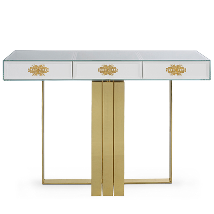 菲利格拉纳控制台奢华珠宝店桌子柜台 卓越优雅崇高透明钢化玻璃不锈钢电镀金色