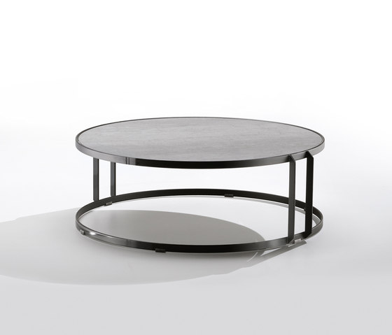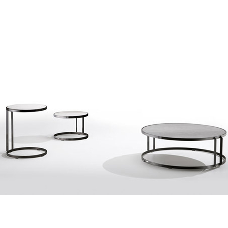镀铬或黑镍的圆形底座连接咖啡桌。顶部陶瓷或软垫在皮革。