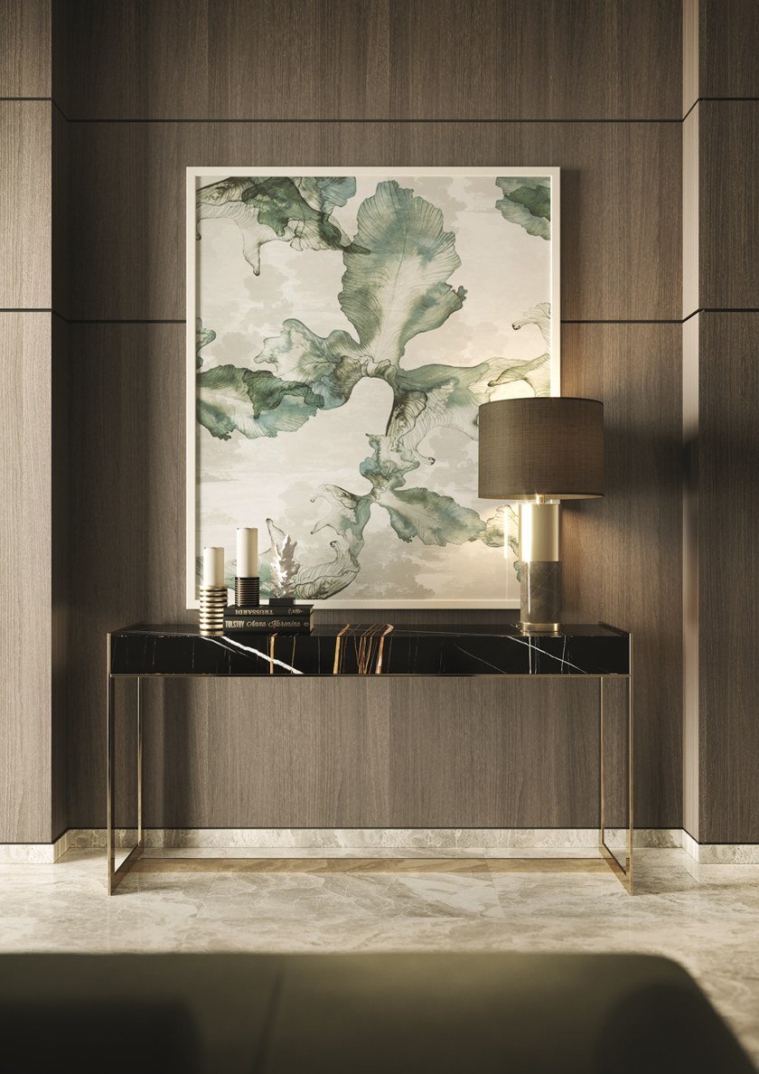 安东尼是一个惊人的控制台由撒哈拉黑色大理石顶部辅以镀金不锈钢底座。走廊装饰的独特作品