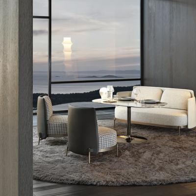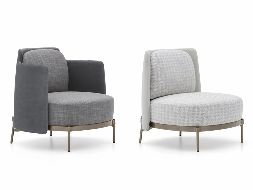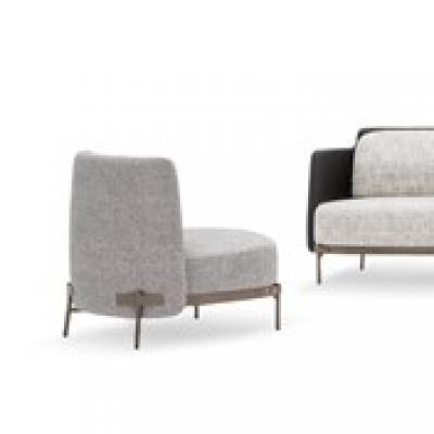 Customizable in a wide range of leather and fabric coverings, it presents two possible sets of pairings. In one version, the fabric covers the back and the seat cushion, while the shell and the tape detail are in leather of the same colour; in the other, the textile envelops the back, the seat cushion and the entire shell, while the tape detail is in Light Bronze-coloured saddle-hide.