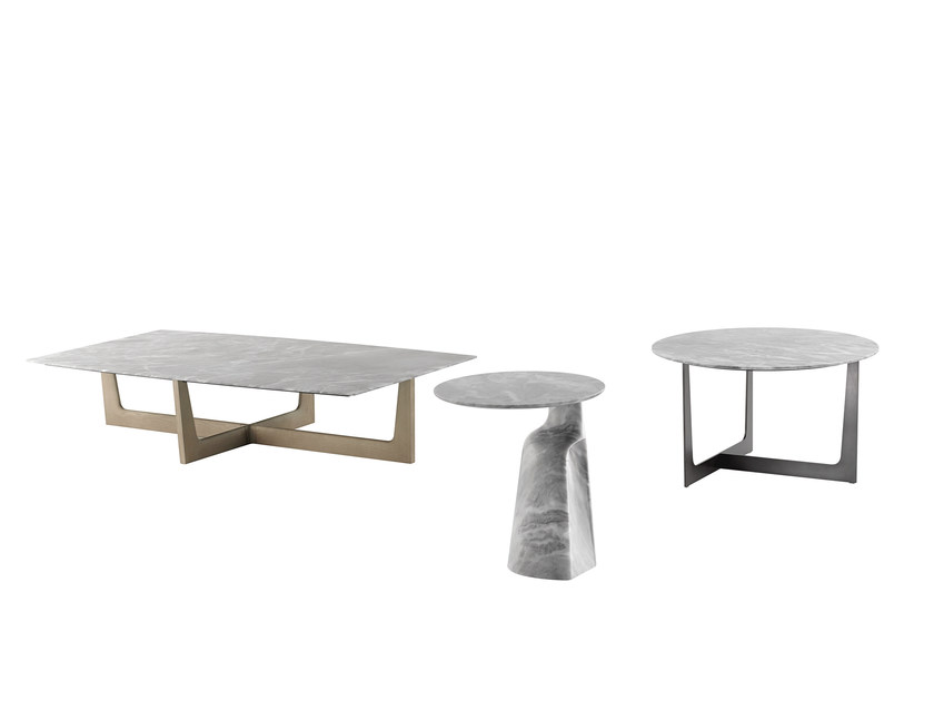 坚实的灰质底座为两个长方形和圆形的矮桌,均为35厘米高。顶部在semi-glossy灰色罗马大理石、选择为其特定的温暖,波尔托那•弗劳灰色颗粒内的哈瓦那棕灰完成木材。顺利设计圆角和软线在顶部和横木。较低的架子是用黑色画桦木胶合板,