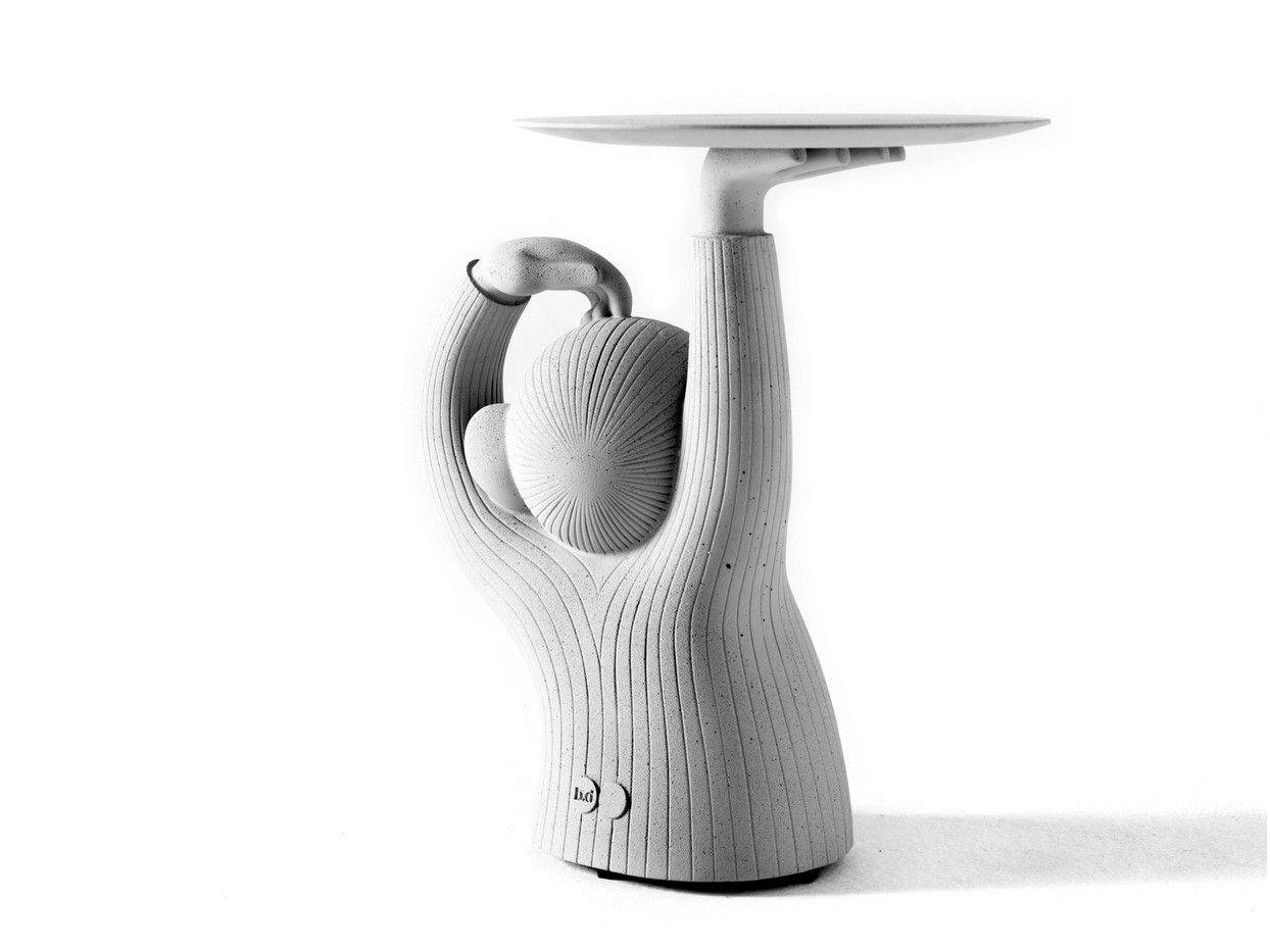The Gardenias adds now a side table carrying his distinct hallmark. The Monkey side table is a useful sculpture. Made of solid architectural concrete for indoor and outdoor use.