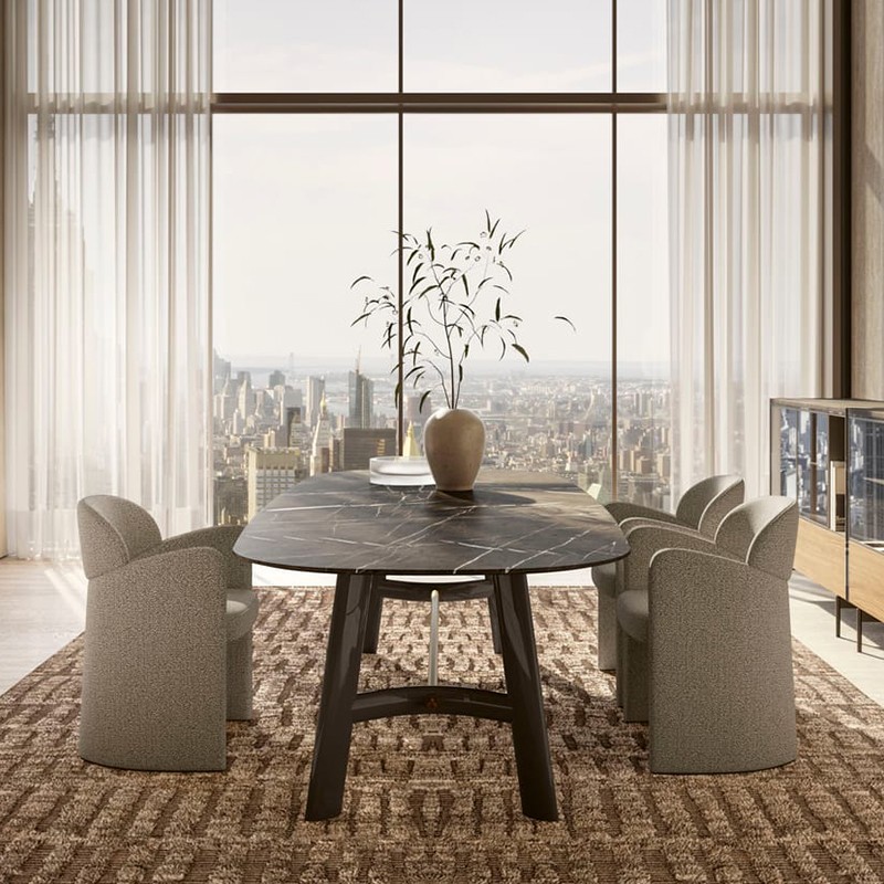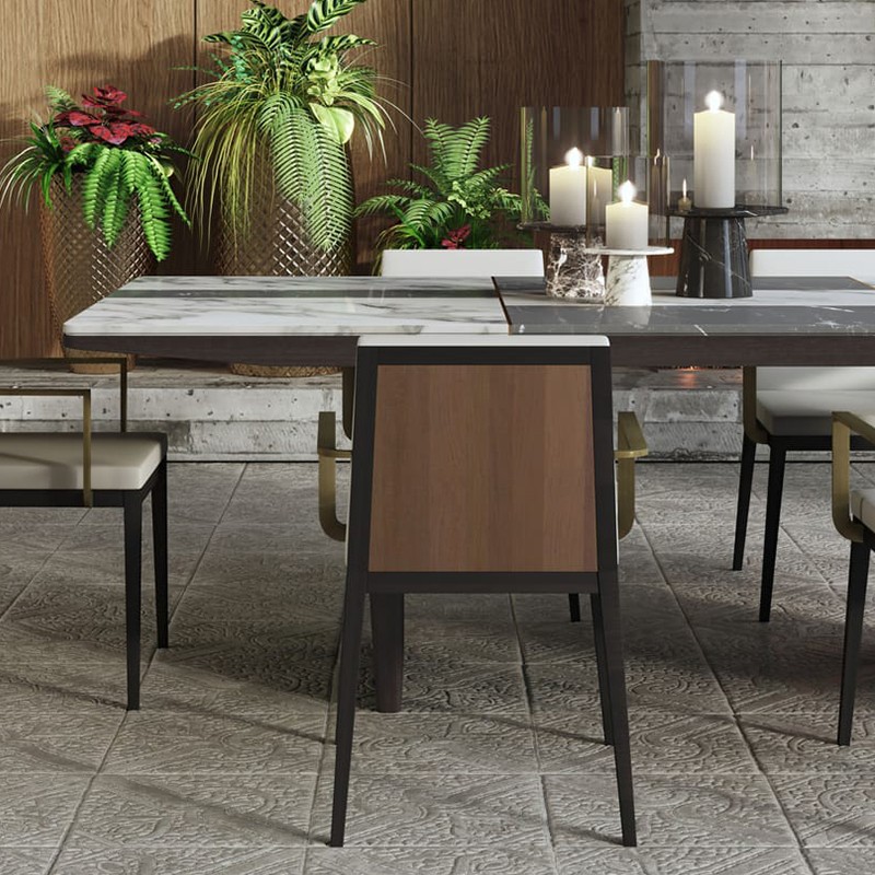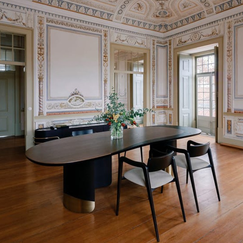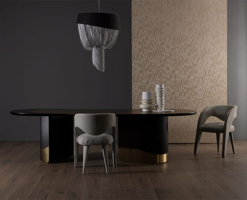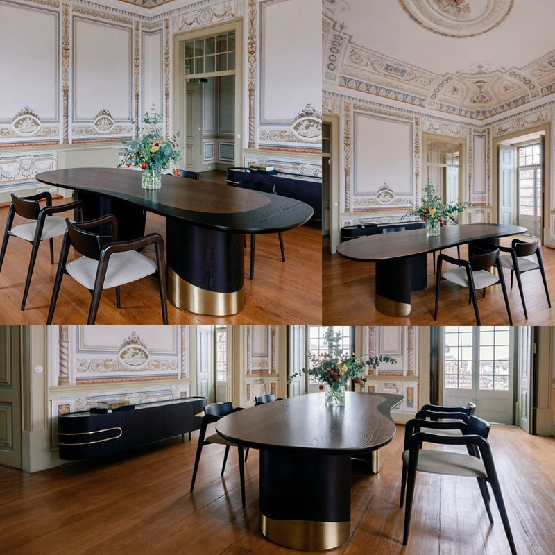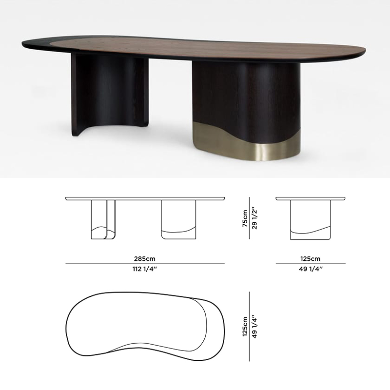 Armona餐桌将原始的美感和精致的设计和谐地结合在一起,体现了Armona岛的形式和温暖。豆形桌面橡木贴面和深棕色漆组成,氧化黄铜色镶嵌物的丰富设计不会让人无动于衷。