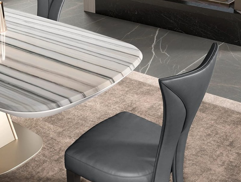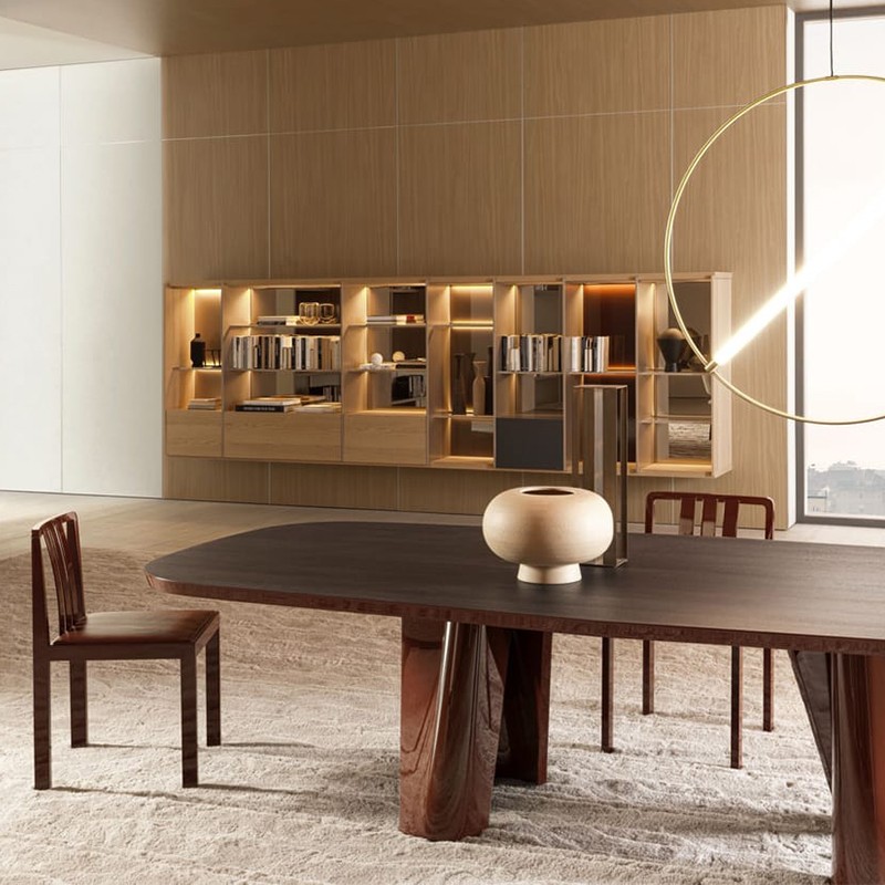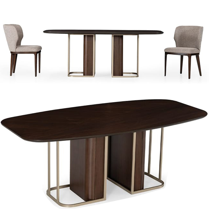 桶形的木制餐桌。以其精致的设计和奢华的风格脱颖而出,将胡桃木贴面的优雅与柔和的漆面和金属细节融为一体。方向运动和线性曲线反映了生活空间的现代奢华风格。
