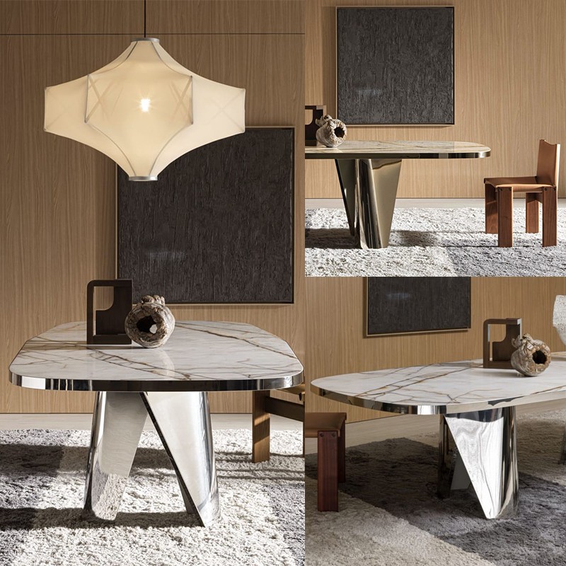 餐桌底座采用不锈钢垫、各种颜色的烤漆金属或抛光处理。
