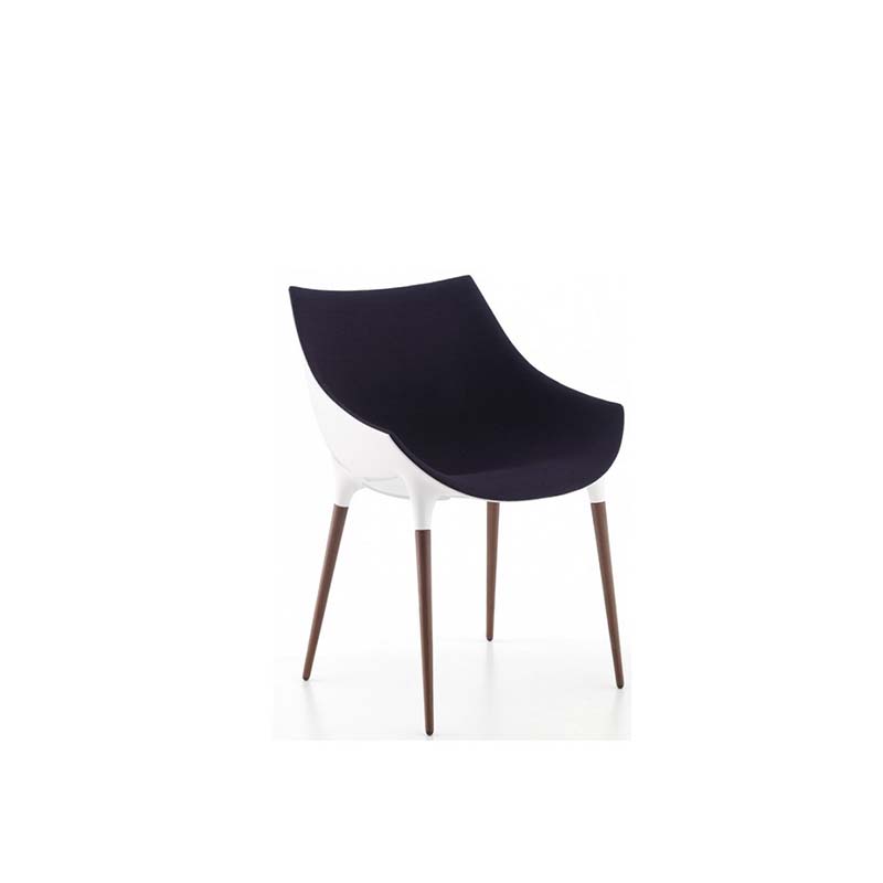 The collection offers a chair and a small armchair with 4 legs in chromium-plated steel and a shell in shiny white or black nylon; polyurethane padding.