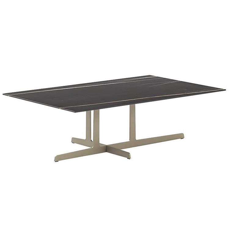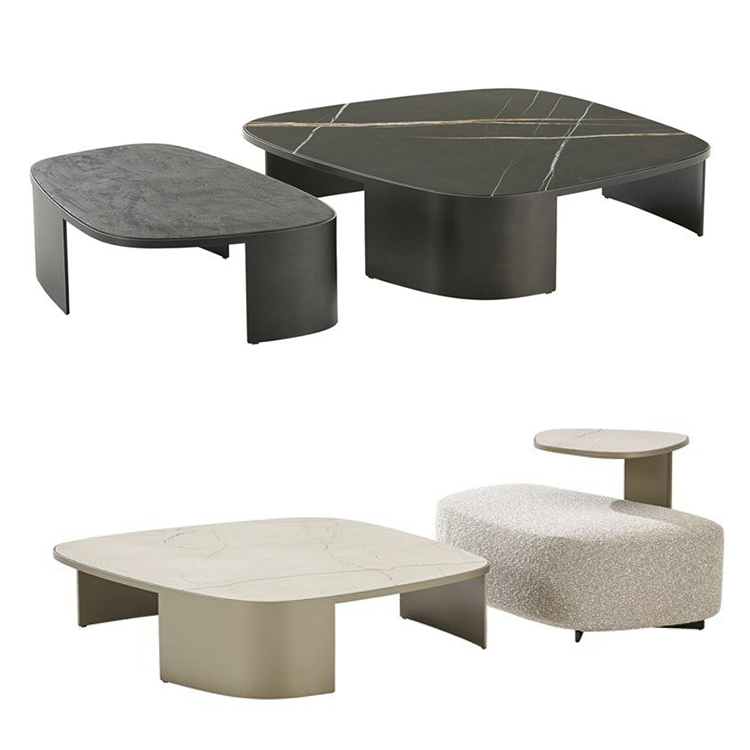 Designed as natural complements to the Saint-Germain system for their organic shapes and quiet elegance, the Koishi coffee tables accompany with personality all the sofas and armchairs in the collection. The sculptural yet minimalist metal structure supports the precious top in ebony stone, marble, reflective glass, or wood.