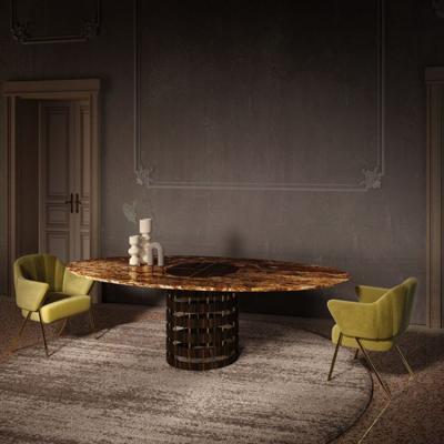 Luxurious trimmings for this majestic table; A brass and wood structure that supports its oval top in gray marble. Astrologer The same finish that recalls The motif of The top, intertwined with thin brass slats for a refined elegance out of the ordinary. Scientist-alternation between full and empty Spaces contradicts the solidity of the top, giving a feeling of unexpected lightness