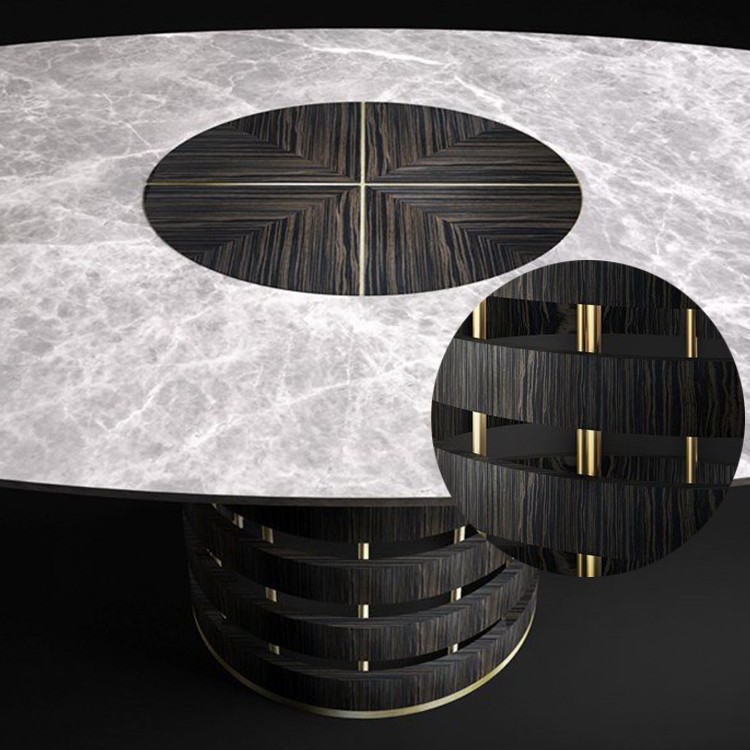 The Conrad table is ideal for important dining rooms and its shape is perfect for generous spaces, Both in classic and modern styles. Physicist The cylindrical base makes it flexible to match The seats and is available in The Slabs round, octagonal and semi-octagonal version. With different glomus, to make ita unique and inimitable piece