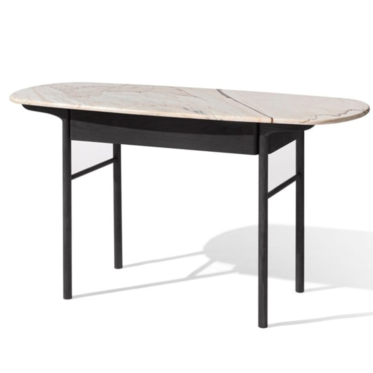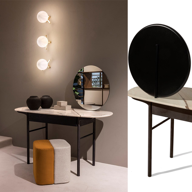 Delorean是一个美丽的梳妆台,其独特之处在于灰木结构和大理石台面,营造出精致而线性的设计。 抽屉有一个软锁定系统,圆形无框镜子看起来是悬挂的。