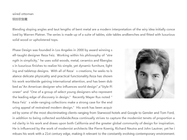 温馨提示:本公司产品来自北欧 欧美 设计师之手! 所有产品1件起定 ! 面料 颜色 规格 均可定制 !承接:样板房,售楼处,别墅,会所酒店配套家具定制!欢迎来图定制!厂家直销,价格优惠reza feiz Phase 专业定制各种现代休闲家具wired side table reza feiz Phase有关产品的任何疑问,请与我司销售顾问联系,我们专业的销售业务团队将竭诚为您提供一站式服务!