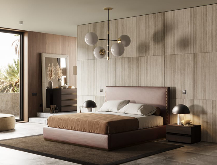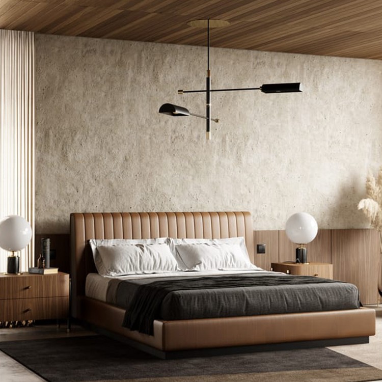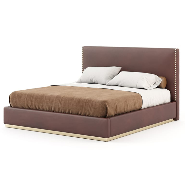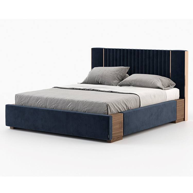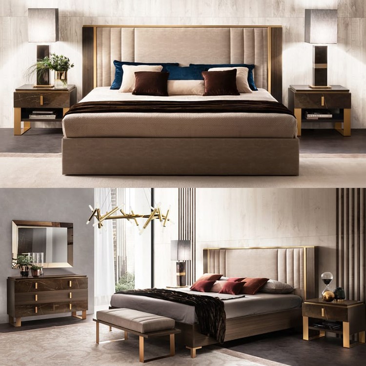 宽而舒适,奢华和优雅,软垫床头板,压线绗缝,垂直镀金条装饰表达了家具的精致,线性而优雅地展示了美学效果。
