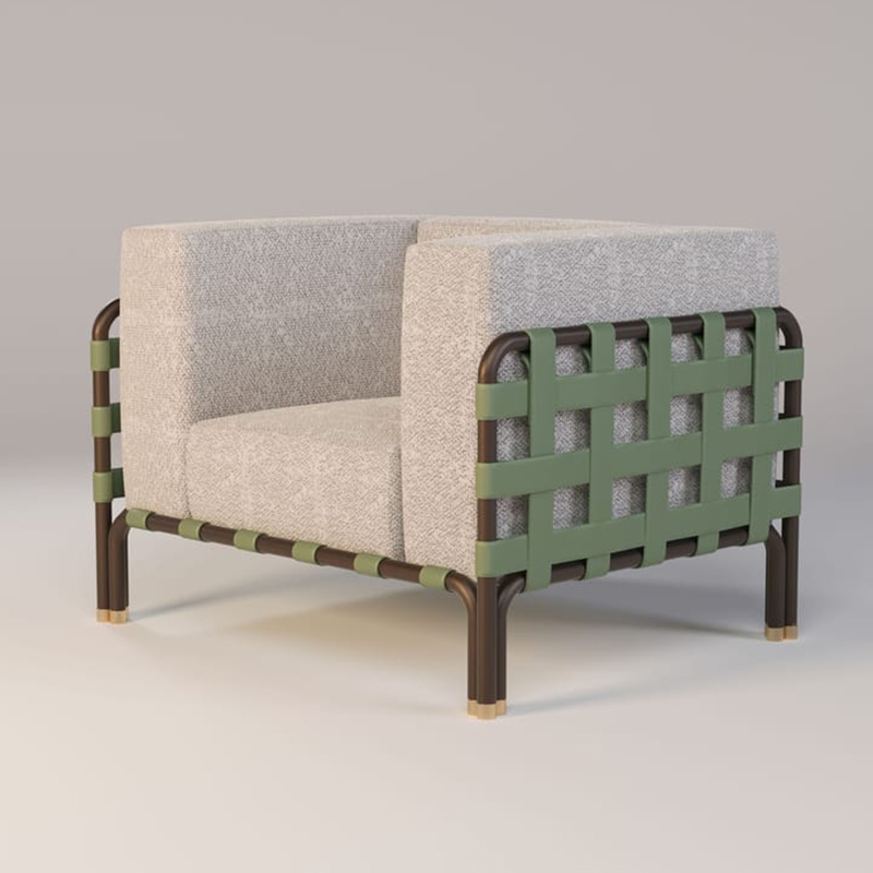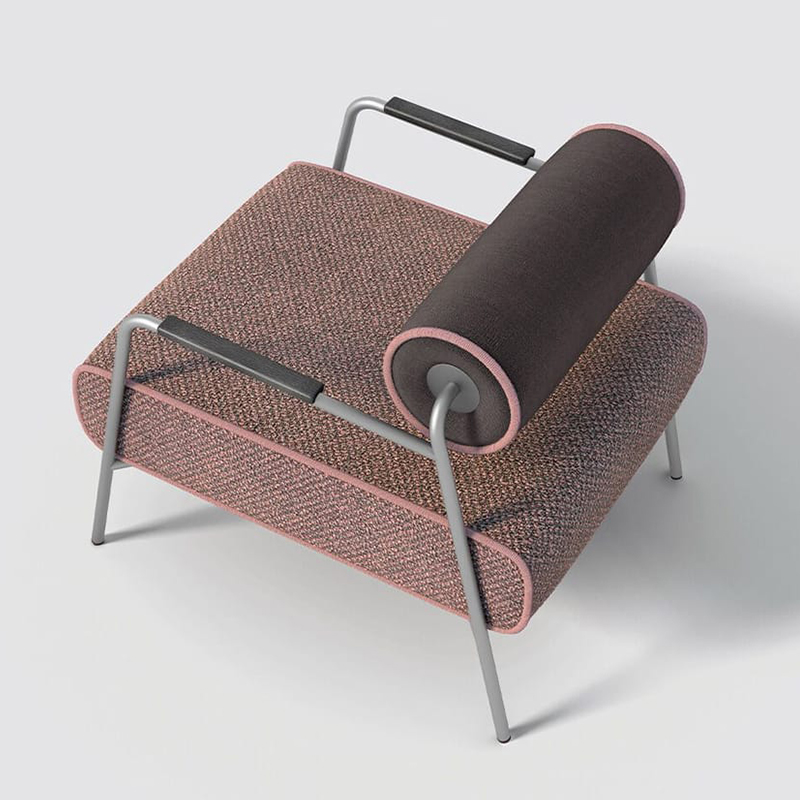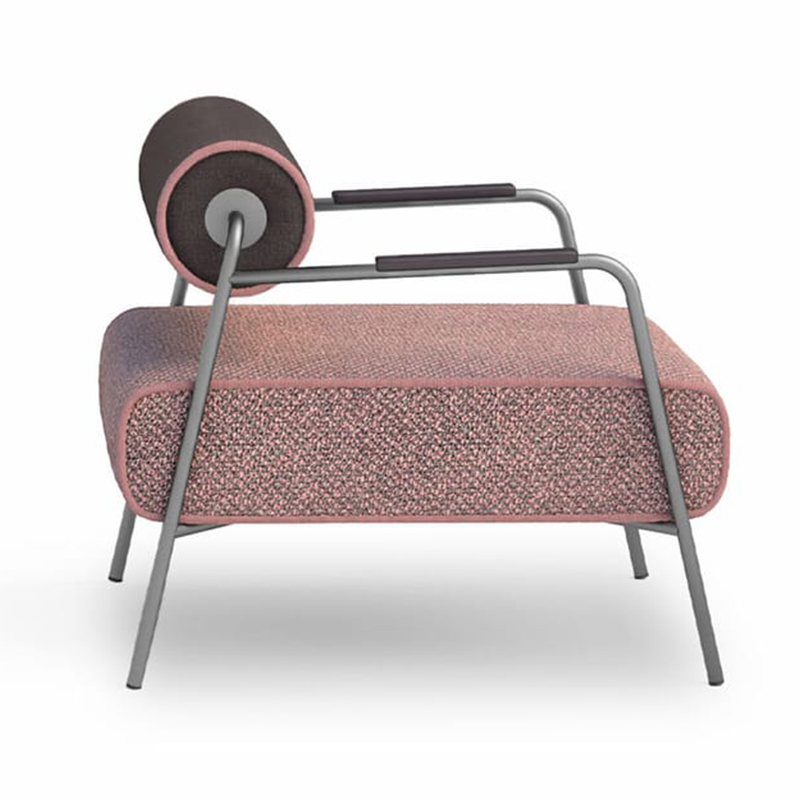 Lapis是一种织物扶手椅,金属扶手覆盖着皮革。