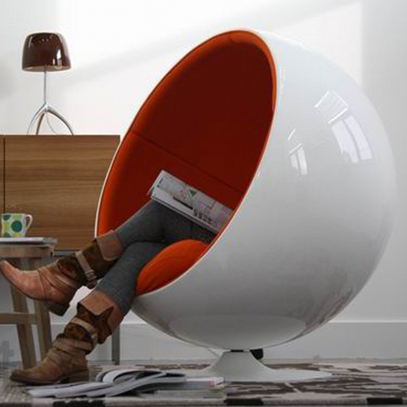 1962年夏天,他用新闻纸和浆糊作原材料,在藤编家具启发下,设计出一种适于塑料制作的面貌全新的坐具造型,这是张以玻璃纤维制成的球形椅子,在受到启.发的之后一直研究,终于在1963年Eero Aarnio(艾洛·阿尼奥)设计了住名的球椅(Ball Chair),很快地这张椅子被大量地制造生产。这张椅子使他在1966年科隆家具博览会上一.夜.成.名。 -