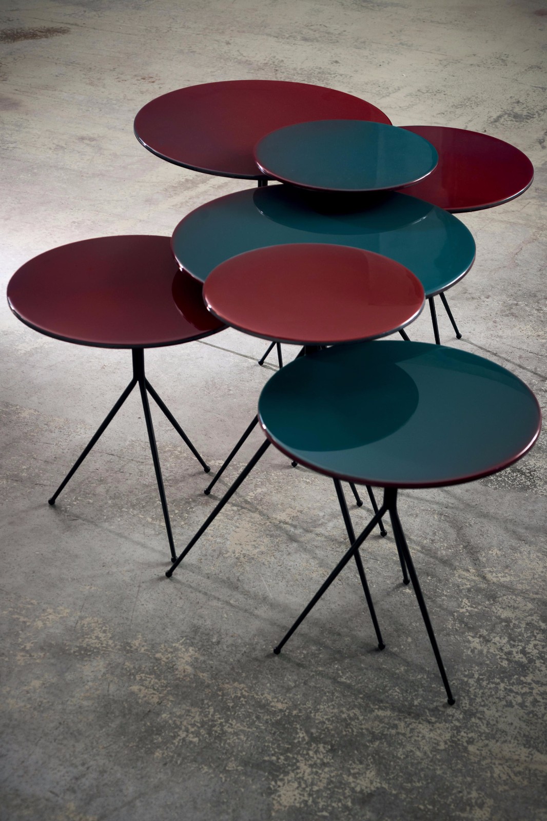 Black satin-finish lacquered base. Smoothed MDF top, 19 mm thickness, decorated by hand with resins smeared in nuance in line with the artist’s creativity and lacquered in eight colours: black/white, blue, grey, aubergine, petroleum, sage, marsala, ash. Surfaces created by hand as “pictures”; each item will therefore be different and unique.